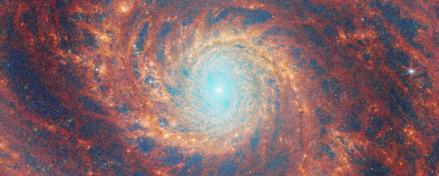 The combined observations from the Mid-InfraRed Instrument (MIRI) and the Near-InfraRed Camera (NIRCam) onboard the James Webb Space Telescope demonstrate that heated dust is concentrated along the spiral arms of the galaxy, and this dust appears as dark red patches. For instance, the orange and yellow spots represent regions of ionized plasma that were produced by star clusters that have only recently formed.